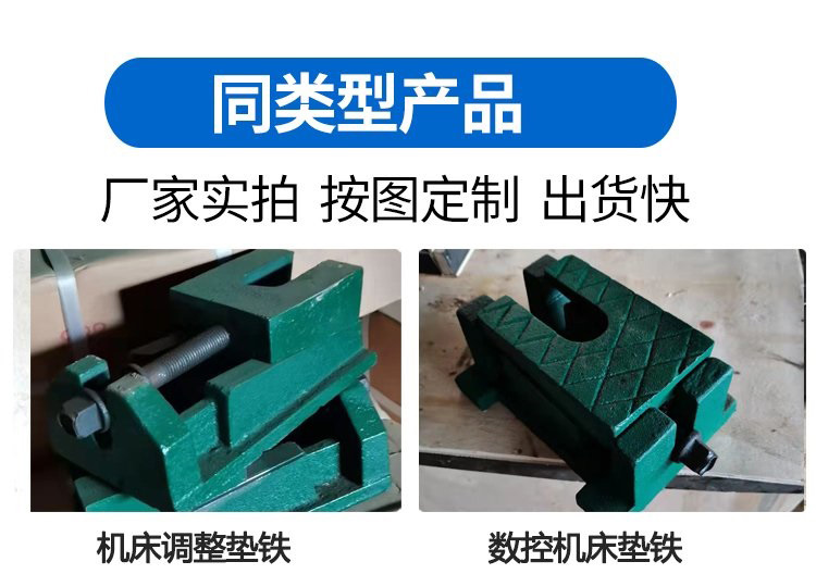 將調整墊鐵分別放在機床各受力點下,每個墊鐵均受力后,然后調整墊鐵??烧{整高度為3mm--15mm 鑄鐵調整墊鐵調整方便,遷移靈活,不用打洞埋設地腳螺絲,不破壞地面,是機床設備安裝工藝的一大改革。能_同床動態特性,提高機床加工精度,具有防震、降低噪音之功能。省工、省時、省材料、綜合經濟益高。為設計部門解決了因設備選型困難,造成地面基礎無法確定的矛盾。通用性廣,適用安裝各類機床與設備。
